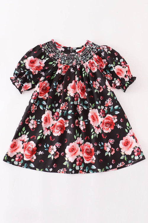 Black Floral Smocked Dress